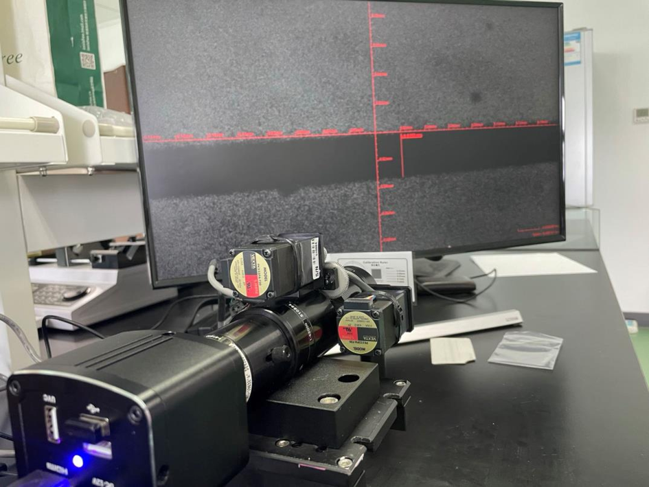 测量 X 射线光斑尺寸,通常将 X 射线入射到闪烁晶体,基于在 X 射线等高能粒子的撞击下,将高能粒子的动能转变为光能而发出闪光,通过变焦变倍显微镜头对闪光点成像和测量,为科研人员光路调试调节提供参考。